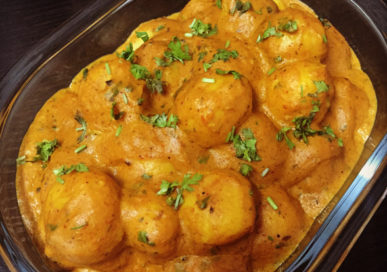 Baby potatoes cooked in yogurt & onion tomato gravy, served with roti, chapati or rice. Potatoes are shallow fried in…
